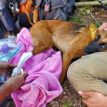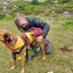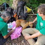 Given Emmett’s size, the difficulty of a pack-out, and his good mobility on 3 limbs, the team decided Emmett could likely return to the trailhead under his own power with harness assistance, if necessary.