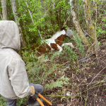 On site, we found Buster down a steep slope, much improved in the health department, though in a more stressful situation than we’d last seen him in.