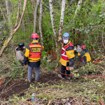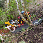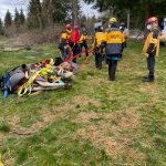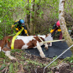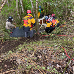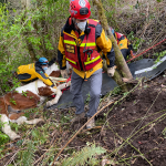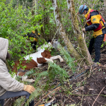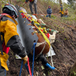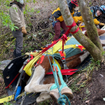 The second part of the haul went well. The slip sheets made the process a lot easier and we were lucky to have the family and volunteers we did to manage the load. Bringing a weight up a hill means you are hauling more than just the weight. There are extra forces added in, and we’ve seen them go up significantly during testing we’ve done. For example, a 1200 lb horse can result in a 7000 lb force on the system. For those who are curious about the technical details, we had a 2:1 mechanical advantage at the nose of the glide and a 9:1 on the haul system, giving us a 18:1 mechanical advantage to complete this response.