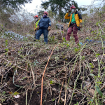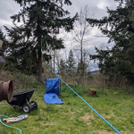 The slope we were on was covered in blackberry brambles. We wanted to minimize both the forces of the pull and the friction from the ground and blackberries as well as try to protect Buster from getting scratched by the blackberry canes, so we used some other sheets of plastic we had as slip sheets for the glide. In the photos, these are the white rectangles.