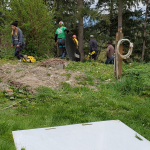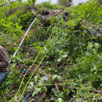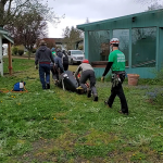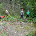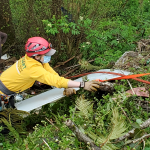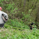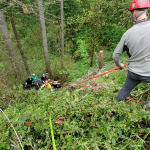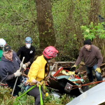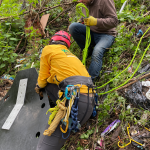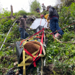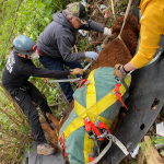 After finishing up tucking her in and securing her hooves, we checked everything. It looked ready to go, and small snores came from Roberta. Dr. Pete felt comfortable with her situation and we called the haul. We had some extra plastic sheets in place to help mitigate the friction as Roberta’s glide when up the steep slope and over some more garbage and logs that we’d been unable to move. The haul went at a slow and safe pace. We had enough haulers and Roberta was light enough we were able to reduce the mechanical advantage and pick up some efficiency. The riggers at the bottom stayed clear of the path behind Roberta in case there was a system failure of some sort.