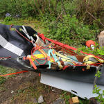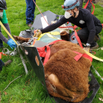 We put the glide in place, against Roberta’s hooves with the glide’s nose facing uphill. We put some vehicle recovery straps around her to pull her over, though we ended up rolling her onto the glide instead. We then attached the straps to a haul rope and had the team pull her up a bit on the glide so we could bend the back of the glide in and secure her with straps. Once that was done, we moved the haul rope to the attachment point under the nose of the glide along with a pulley to give us some mechanical advantage there.