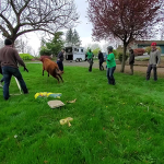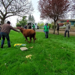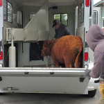 From there we unstrapped her. Dr. Pete took her lead rope and told her it was time to get up. She got to her feet and showed us some more of her feisty side, bucking and trying to get away from Dr. Pete, who has had plenty of experience with cattle.