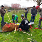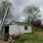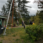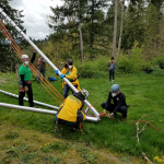 The team got busy setting up the tripod, which would act as a redirect so we could get the cow over the lip of the edge with as little trouble as possible. Guy lines were attached to the top of the tripod, and the haul rope routed through the apex of the tripod and back for the haul team.