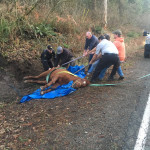 Flame’s owners and some friends, other passersby, and a couple of King County, WA, animal control officers had put some straps on her and a tarp underneath to attempt to pull her out (see photo).