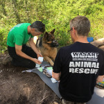The last 1/4 of the trip had us a bit concerned about the technicalities of getting the dog safely out if it turned out we wouldn’t be able to get him to walk. The rock and other geographical features meant we’d need to be creative with rigging or call in more rigging help. Moving a litter down a trail is tiring under the best of conditions, but this would be difficult as well as challenging.