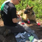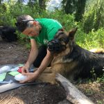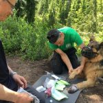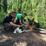 We met up with the subject, Kodin, a beautiful 3-year-old King German Shepherd, his owner, and three adults in a small flat space not too far from where the trees give up before Gothic Basin becomes a landscape of just rock with a couple of lakes. The three adults with the subject and owner were passers-by that paused in their own trips to help out. One of them owned the inReach, and the other two were college students. They stayed with Kodin and his owner overnight, and provided basic pet first aid, such as wrapping his injured paws.