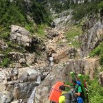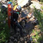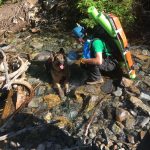 The last 1/4 of the trip had us a bit concerned about the technicalities of getting the dog safely out if it turned out we wouldn’t be able to get him to walk. The rock and other geographical features meant we’d need to be creative with rigging or call in more rigging help. Moving a litter down a trail is tiring under the best of conditions, but this would be difficult as well as challenging.