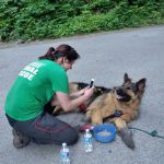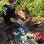 One of our responders is a vet, and he took the lead in examining and rewrapping Kodin’s paws. The previous wrap job was well done, though we ended up adding more padding in the form of folded over maxi-pads (the cheaper the pads, the more padding!), wrapped with vet wrap, duct tape then covered with a sock on each paw, and added more duct tape on top of that.