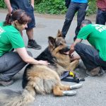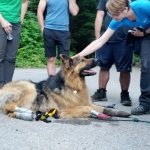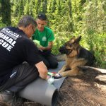 We put a lift harness on him and tied 25 ft. 8 mm rigging rope to the harness to act as a belay and help brake him on the way down. Thanks to the extra padding in the new wrapping and Kodin’s fortitude, he began to walk. The difficult parts came nearly immediately, with very steep somewhat sanded-down rock faces. Kodin was understandably hesitant. Between the belay rope and the patient encouragement of his owner, Kodin made it down the first and the next. Slowly he gained confidence and trust in us and the process.
