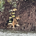 As we reached the dog, he appeared cold and wet but otherwise okay. We placed him in our raft and secured him for the trip across the river. We then traversed the river to the near shore where the TRT and base ops were ready to receive him. The dog was readily taking treats, pets, and praise on scene.
