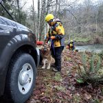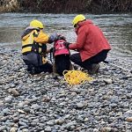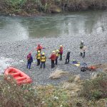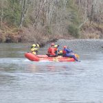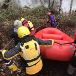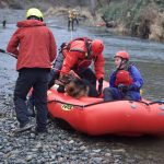 As we reached the dog, he appeared cold and wet but otherwise okay. We placed him in our raft and secured him for the trip across the river. We then traversed the river to the near shore where the TRT and base ops were ready to receive him. The dog was readily taking treats, pets, and praise on scene.