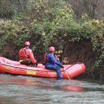 We launched our raft with four members of the Water Rescue Team onboard and paddled upstream of the dog’s location. Two members of the WRT were let out of the raft, each with rope bags, on a sand and rock embankment shortly upstream of the dog. Once these team members and their ropes were ready, they carefully lowered the raft downriver using ropes to control its mobility until we arrived at the dog’s location.