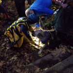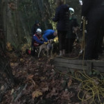 The lift went well and soon Dr. Dahl and Nash scrabbled over the crumbling edge of the drop-off just as it was getting dark. Nash, tired from his ordeal wanted to lay down immediately but saw his people on the trail and made his way over to them as soon as he was released from the harness and attached to a leash.