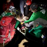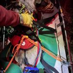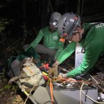 We set up a twin tension rope system. The attendant was lowered down the steep hillside to Pogo who appeared alert. After placing a muzzle and harness on Pogo, he was secured in the rescue litter for the ride up. The rope system was changed from a lowering system to a pulley system to haul them both back up to the top. Once at the top of the hillside, the team hand carried the litter over a chain link fence to reach our base location. We unpacked Pogo from the rescue litter and placed him into the owner’s car for the ride home.