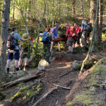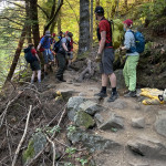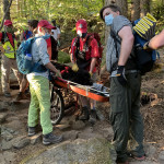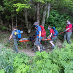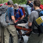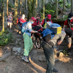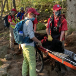 We headed carefully down the trail. More ESAR volunteers met up on the way down, lending extra hands and fresh muscles to the trip down the trailhead. We stopped occasionally to offer Sam some water and swap out volunteers on the litter.
