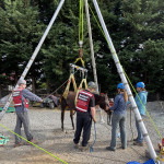 On June 13th we received a call for assistance with a 30-year-old female Mustang horse named Summer. She laid down in her stall during the night and was unable to get up on her own. Her owner stated she had arthritis in her hind end but was an otherwise healthy horse. A veterinarian was on site to evaluate and tend to Summer. While it is common for horses to lay down, being down for extended periods can be dangerous for them.