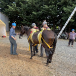 We cushioned and packaged Summer on the glide for her safety during the move and lift. We attached the Becker sling to her so we could go directly to the lift once outside. Using a redirect anchor and haul line, we moved her from the stall to the main hall of the barn. Once there, the glide was attached to a small tractor and Summer was slowly moved outside the barn and under the nearby tripod. We then attached the spreader bar to the Becker sling and removed the glide. When everything was ready and safety checked, we raised her to a standing position using a second haul line attached to the spreader bar of the tripod.
