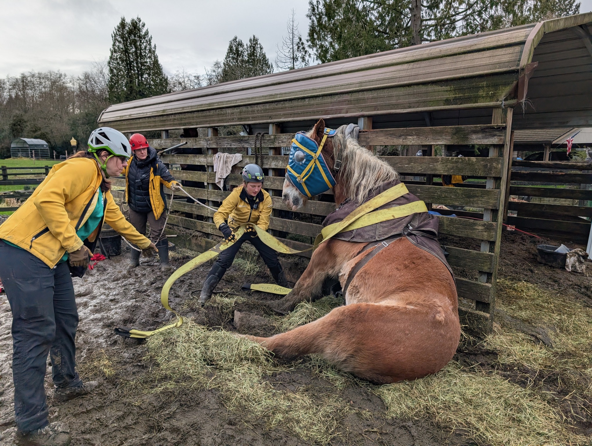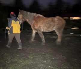 We received a call about a 23-year-old draft horse named Theo, who we had previously met last year. He had been stuck down against a wall overnight and was unable to get back on his feet. We deployed with our rescue truck and equipment trailer.