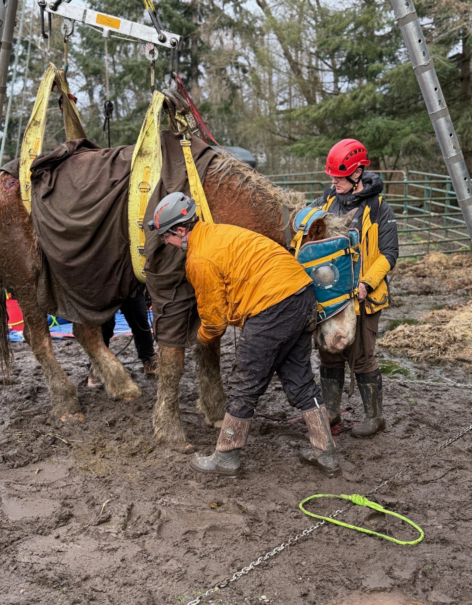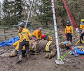 Because Theo weighs close to a ton, we knew this was a high-risk situation for both him and our responders. Working alongside the veterinarian, we immediately began setting up our tripod and haul systems using our specialized rescue equipment.